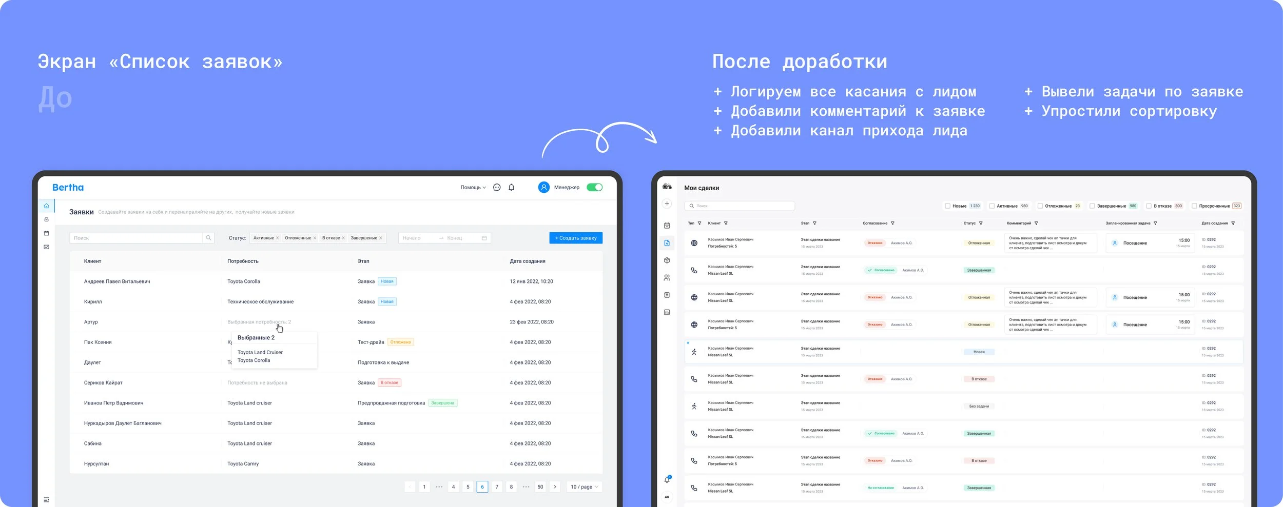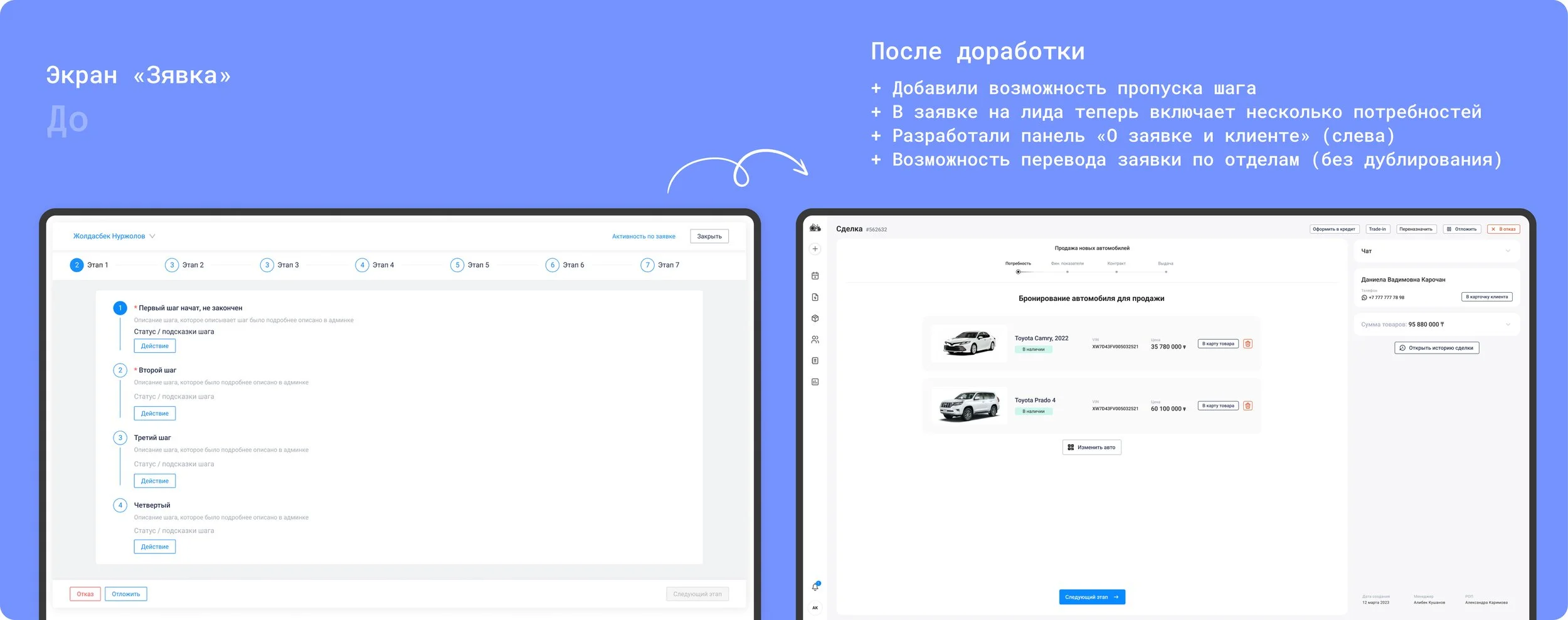 Основная проблема заключалась в отсутствии целостной архитектуры продукта. Интерфейс не масштабировался под новые функции, а ключевая бизнес-логика была нарушена — после закрытия сделок информация о клиентах и автомобилях терялась в архивах, не привязываясь к единым сущностям. Это приводило к потере критически важных данных и снижению эффективности взаимодействия с клиентами.